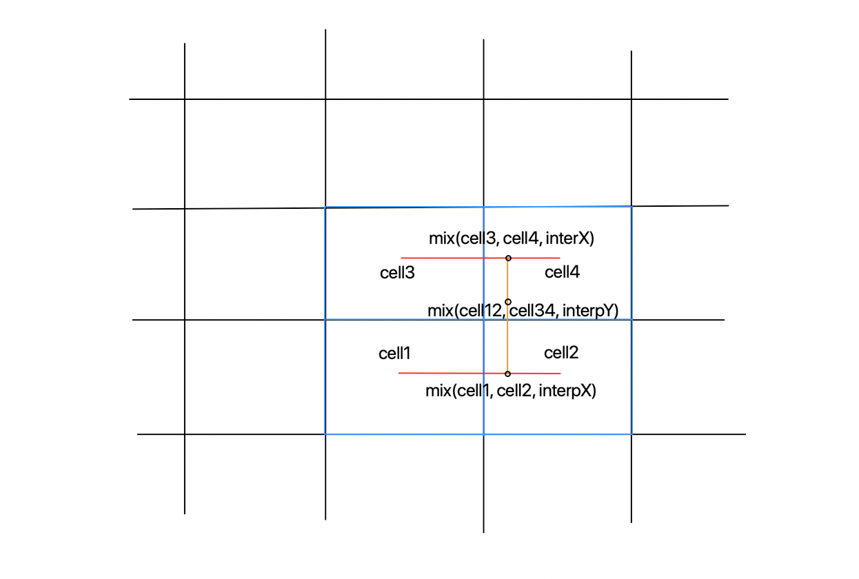vec2 f = floor(vec2(x, y)); vec2 i = fract(vec2(x, y)); float ceil1 = random(f); float ceil2 = random(f+vec2(1,0)); float ceil3 = random(f+vec2(0,1)); float ceil4 = random(f+vec2(1,1)); float ceil12 = mix(ceil1, ceil2, smoothstep(0, 1, i.x)); float ceil34 = mix(ceil3, ceil4, smoothstep(0, 1, i.x)); float result = mix(ceil12, ceil34, i.y);