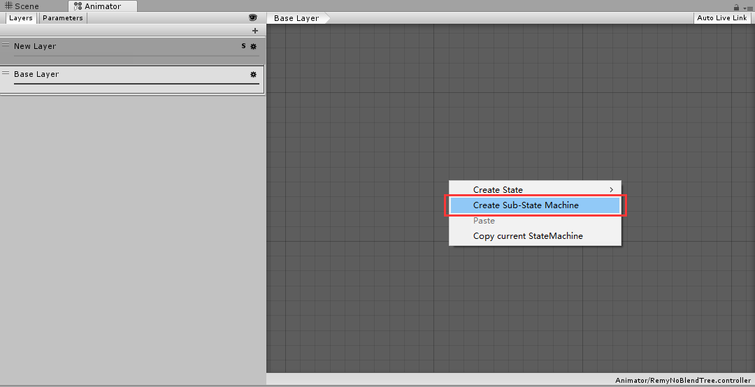 这样分拆的动画更利于控制,但是带来的负面影响是状态机会变得庞大、复杂、难以管理。这时候,可以使用状态机提供的子状态机的功能,将这些状态整合到一个子状态中。
