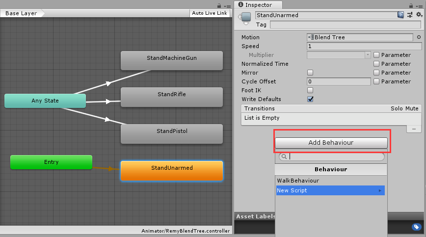 选中一个State,点击Inspector中的Add Behaviour按钮可以选择已有的StateMachineBehaviour或创建一个新的StateMachineBehaviour。