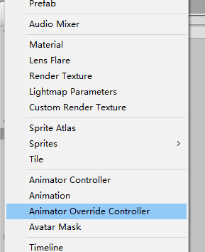 在Project中的Create菜单中,选择Animator Override Controller。