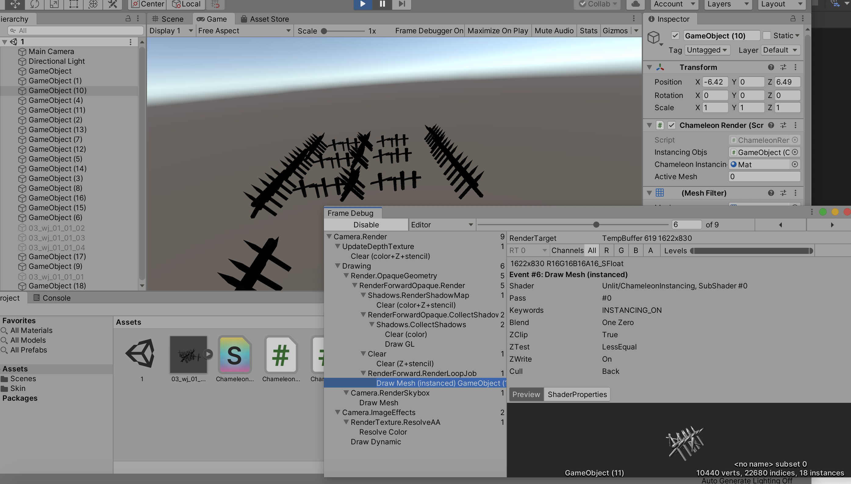 如上图,我合并了3种不一样的模型,使用了一个批次。 三种模型是动态合并的,再uv8中标记的meshID(这三种模型的对应ID) MaterialPropertyBlock中指定了需要显示的mesh shader中对非meshID的mesh在clip空间做顶点offset,将它移出视锥。 TB(D)R的在视锥三角形剔除上相信还是很高效的,虽然这边三角形处理量会变多,但是只要它不写回内存parambuffer就不是很过分,相比传一个很大的buffer进去io的消耗,处理一个小buffer中的三角形乘以一个矩阵再剔除明显比较高效了。 现在只做了mesh的,还需要做材质不同属性的合批,以及lightmap的合批,最后看能不能用于不同特效的合批。 需要几个朋友一起完善一下,有兴趣的朋友可以加我微信 smartethet,后续会开一个新的仓库迭代。 github:https://github.com/smartether/ChameleonInstancing 文章可能会有后续更新,可以多回来关注。