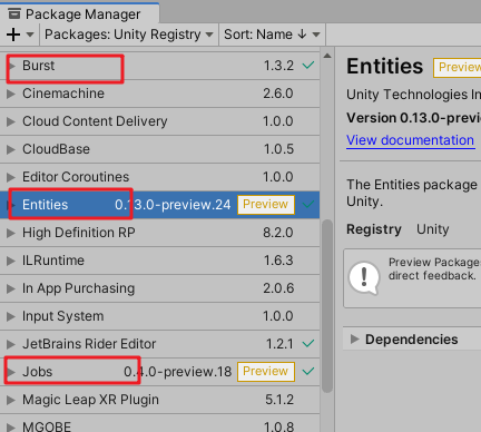6、这时候你再去看Package Manager的列表,就能看到DOTS三件套都安装好了。