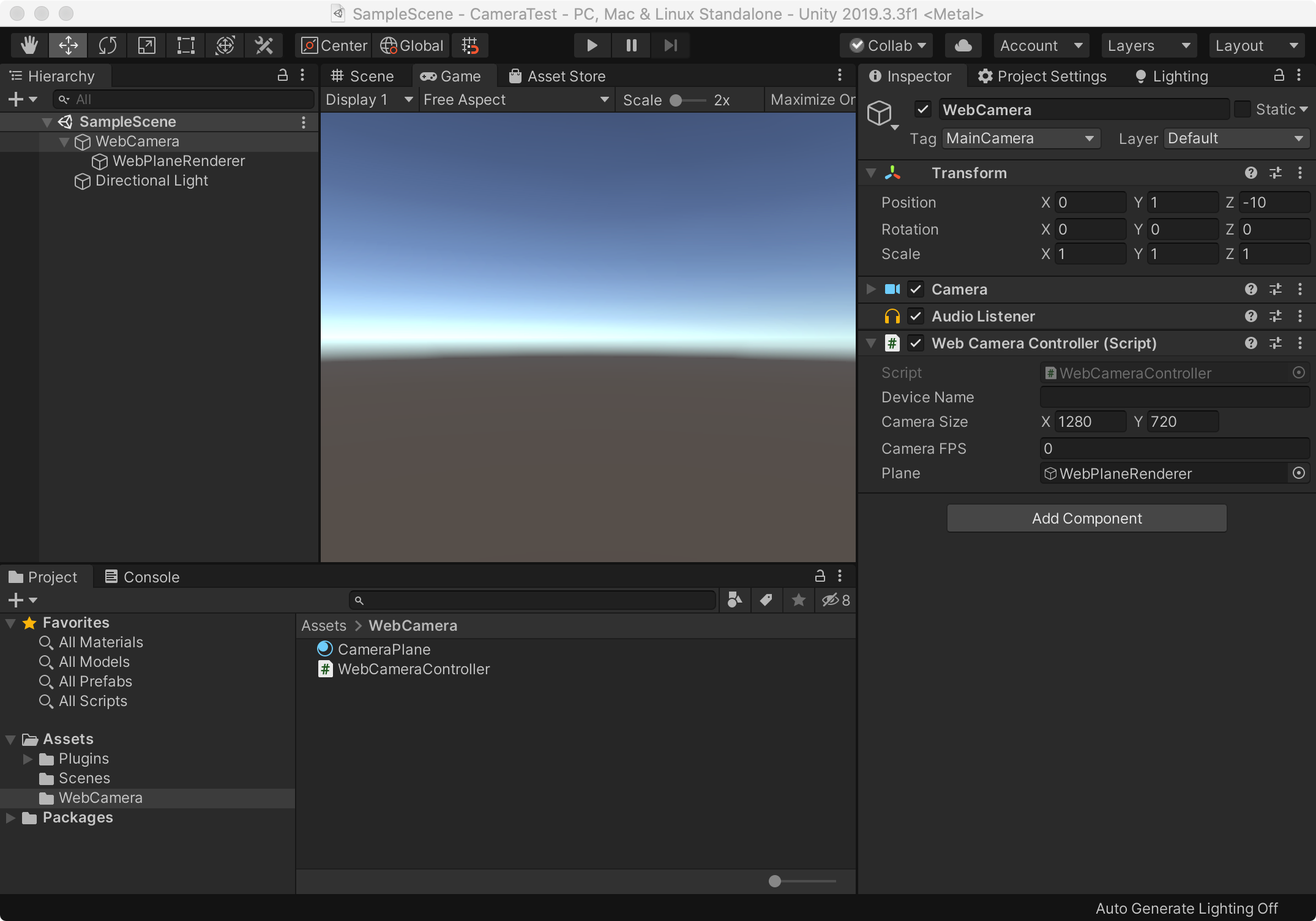 步骤二:新建相机Camera,可以命名为WebCamera,并且在WebCamera 创建子对象Plane, 注意Plane的Rotation(x:90 y:180 z:0),接着把CameraPlane.mat 附加上。