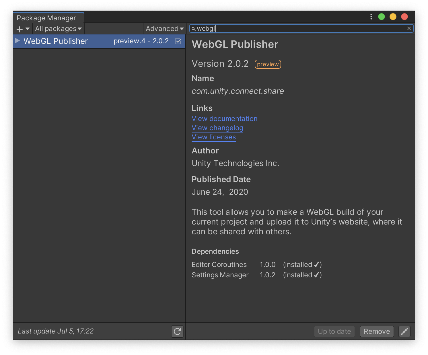 我们需要安装一个 package 插件包 :WebGL Publisher