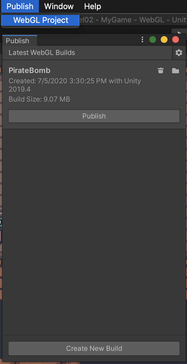 安装好了 WebGLPublisher 的插件包之后,你的整个菜单当中会多出来一个 Publish 的菜单,里面可以打开一个窗口叫做: