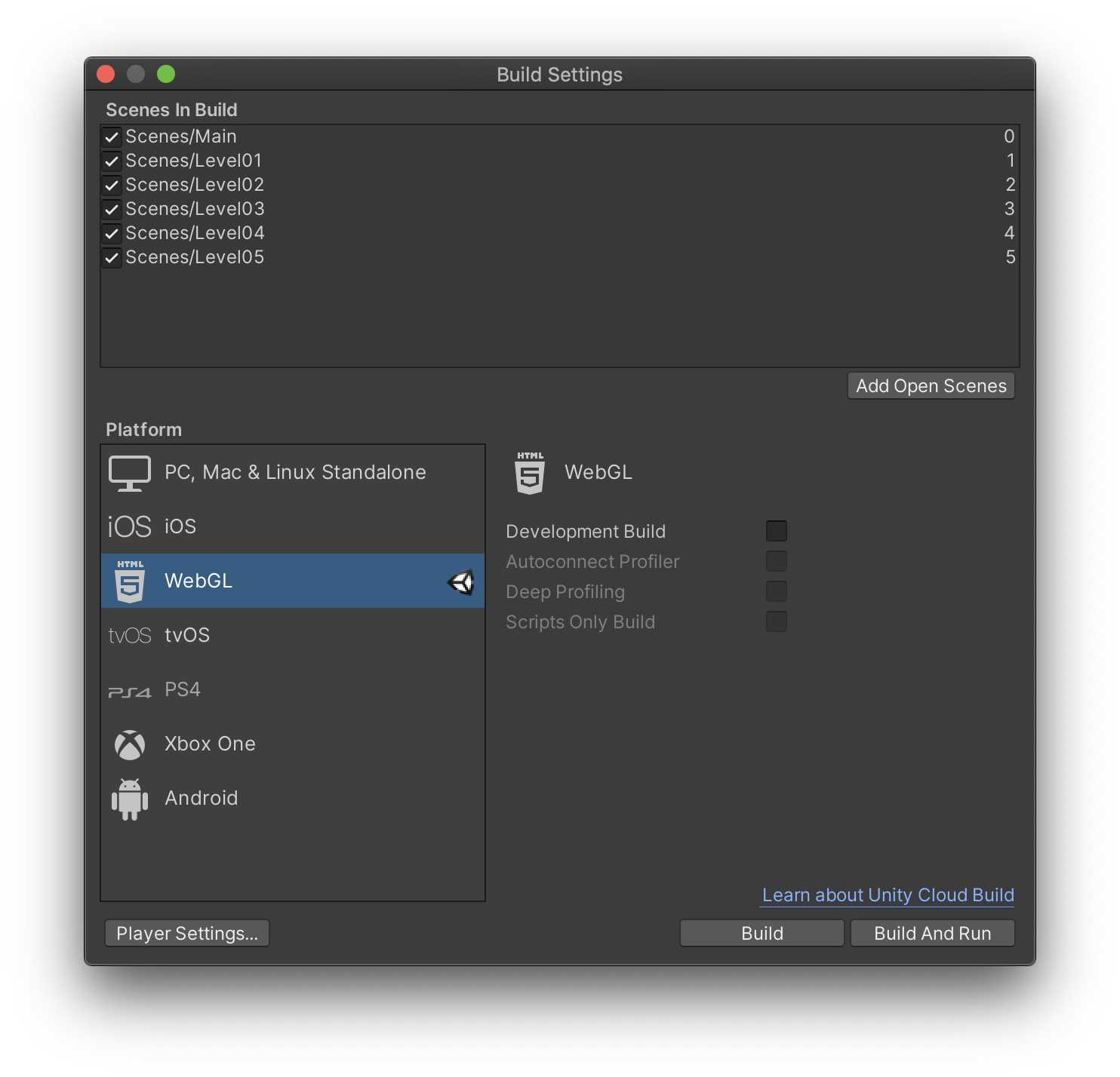在 Build Settings 中将你的整个游戏项目切换到 WebGL 平台