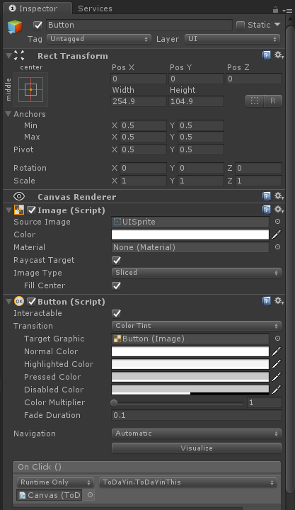 ` 5.在场景中新建一个Button,将ToDaYinThis方法赋值到该button上,如下图所示: 6.打印效果如下所示,哈哈。因为打印了一张白色图片,所以什么也没有打印出来: