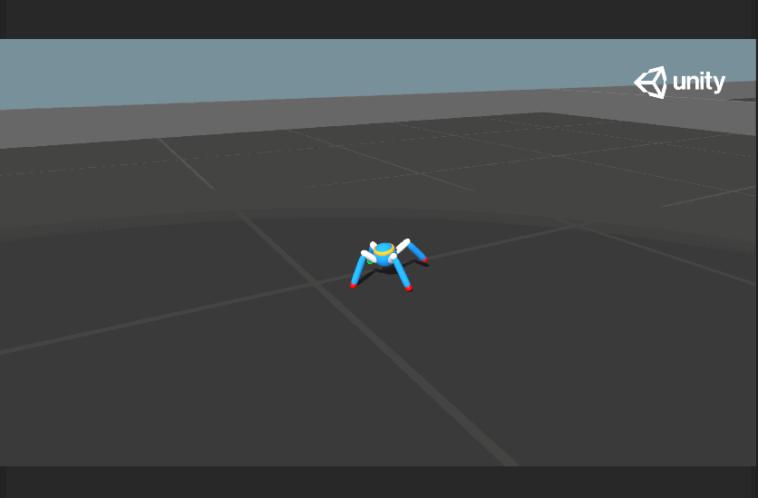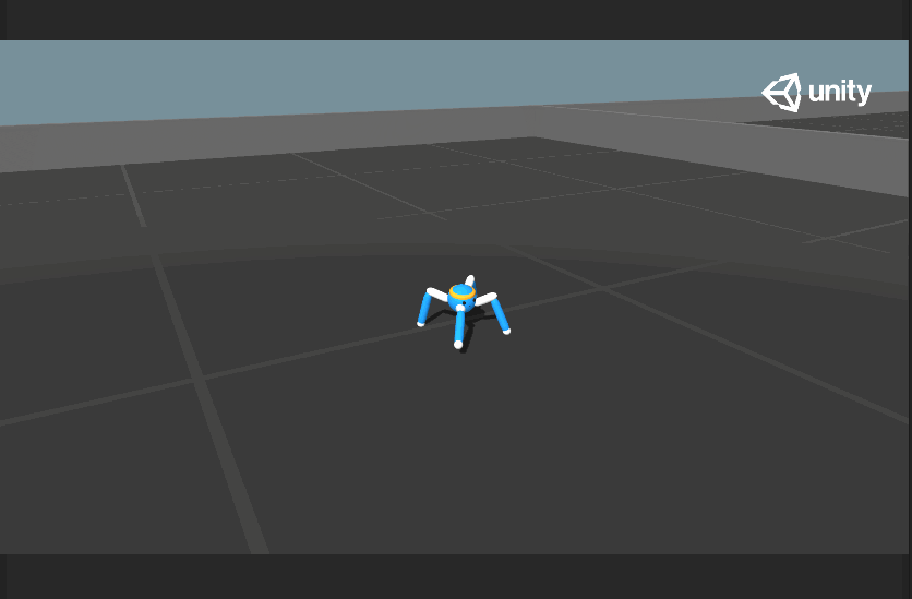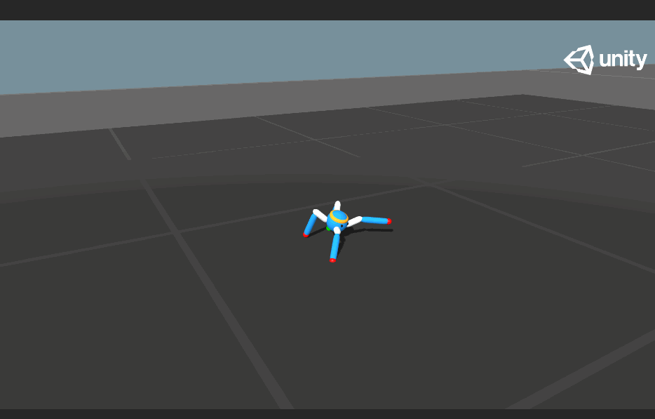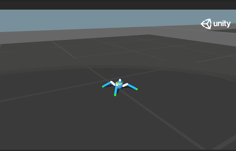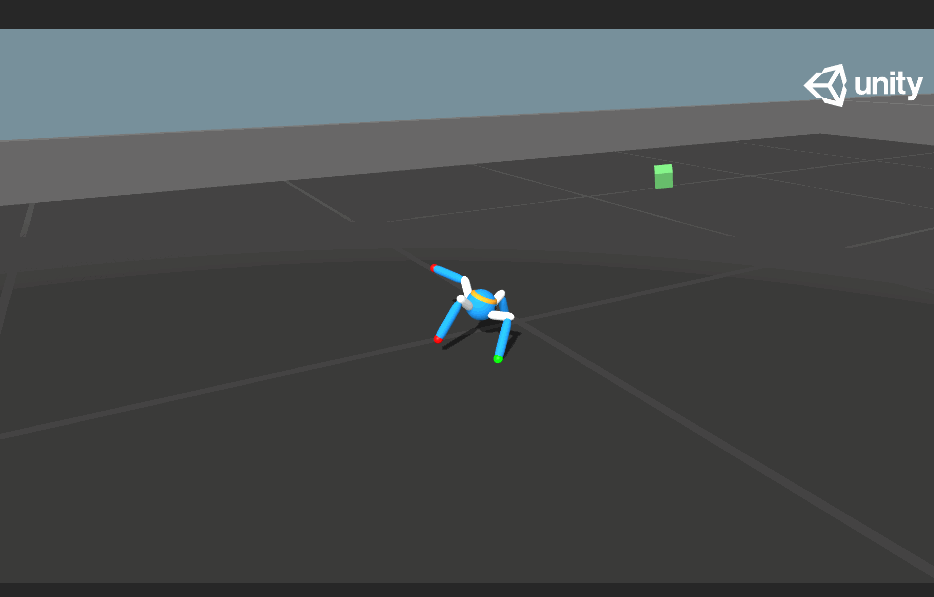 可以看到这次小蓝变成了一只四脚爬虫,每只脚上有两个关节,其任务就是通过四肢协调运动找到绿色方块。大概可以预想到,这个示例在开始训练的时候先要解决的问题就是小蓝怎么通过四肢协调站起来不摔倒,然后进行移动,最后才是找到绿色方块。