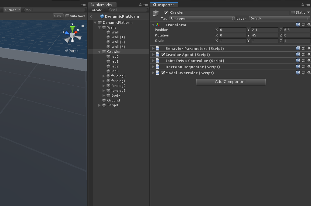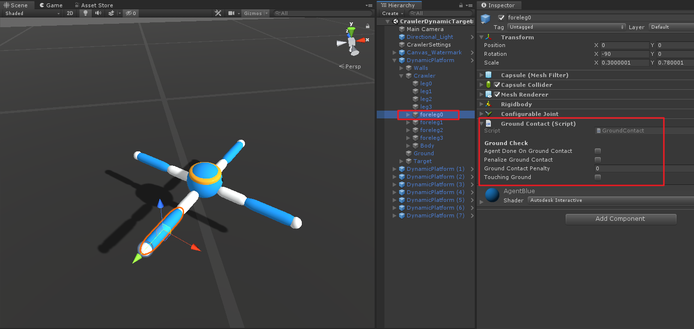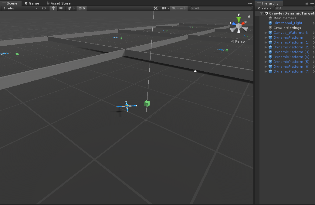 此外,该示例有两个场景:CrawlerDynamicTarget和CrawlerStaticTarget,分别是动态目标物和静态目标物,上图展示的就是动态生成目标物,绿色的方块会产生到随机的位置,而后者是绿色方块就在小蓝的前方。因此我们直接研究较难的CrawlerDynamicTarget示例,CrawlerStaticTarget也就迎刃而解了。