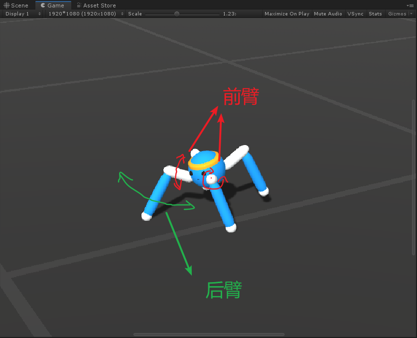 每个后臂还有一个脚的子物体(就是那个小圆球),我看官方本来是想在脚接触地面时令小球换个材质,不接触地面时又是另一种材质,但是示例中最终并没有使用该方法,我们可以来试试这个功能: