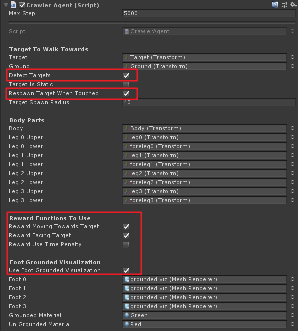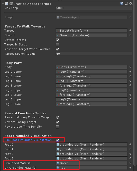 建立两个材质球Red和Green,然后分别将这两个材质球拖到Crawler预制体的Agent脚本上,并勾选Use Foot Grounded Visualization选项: