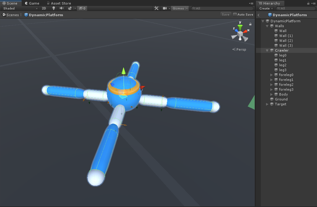 我们这次来研究一下Crawler(爬虫)示例。官方其实还有个示例——Reacher,但是这个示例比较简单,就是模拟一个带两个关节的手臂去跟随目标物体,其核心就是让我们学会如何利用Configurable Joint来进行训练,相比之下,Crawler就复杂得多,因此我们跳过Reacher这个示例,感兴趣的童靴可以自己去研究一下。