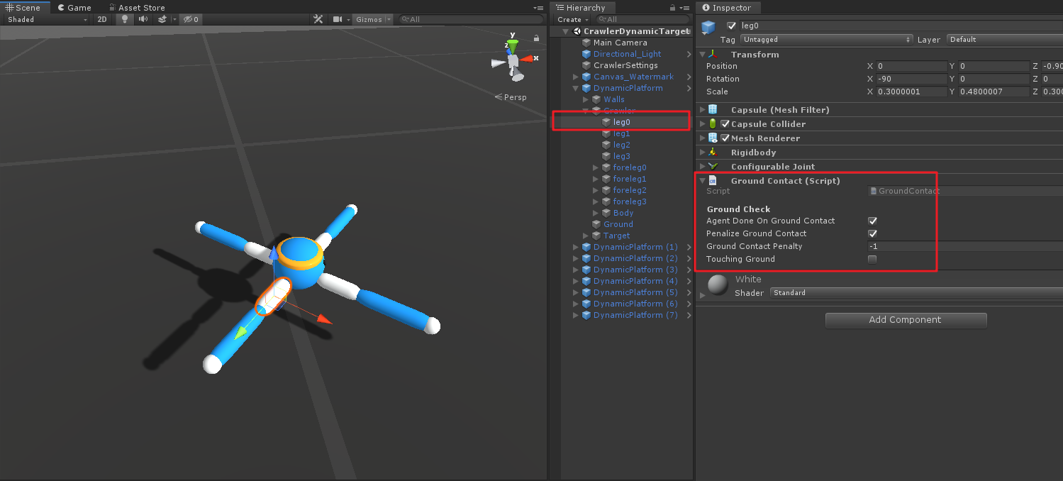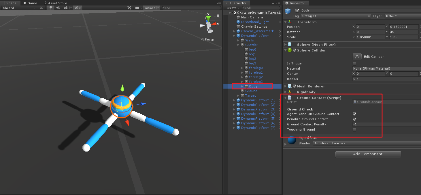 除此之外,Crawler的Body还有一个GroundContact脚本,该脚本是用来检测Crawler是否摔倒,即头部触地,此时可以对agent惩罚1,并重新开始新的Episode,这两个都是可选的: