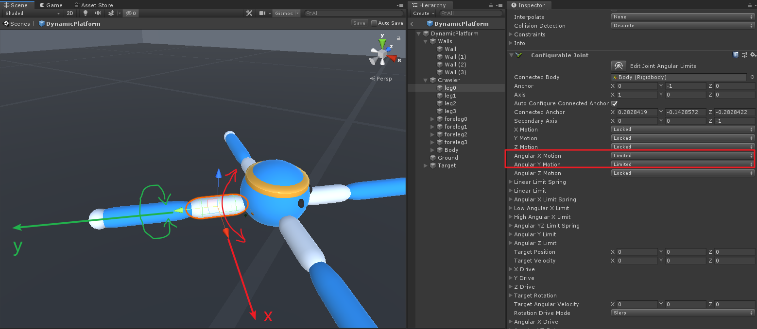可以配置的参数非常多,但其实很多都是基础的参数,各个参数是如何限制该关节的,建议大家自己下去后再去深入研究,我们这里大概可以看一下Crawler的四肢是如何运动的: 首先看前臂: