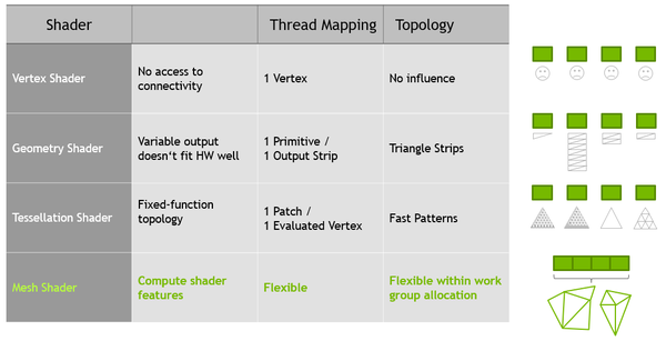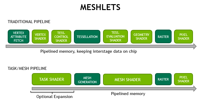 #2 图灵显卡上的mesh shader 最早的渲染管线属于硬件管线,随着软硬件的发展变为可编程管线。这个阶段我们听到的最多的就是VS和PS即顶点着色器和像素着色器。 但这不是可编程管线的全部,随着硬件和画质需求的不断增强,还有诸如曲面、几何着色器等流程加入可编程管线中。 流程越多越固话,表示要重复处理的东西就越多。因此NVIDIA 启用了新的Mesh Shading 管线,将光栅化阶段前的阶段整合为两个,task 和 mesh。 对比一下两个管线,可以发现光栅化之前的流程都重做了,而光栅化之后的可以复用。 Task着色器: 一种可编程单元,在工作组中运行,允许每个工作组发起(或不发起)Mesh 着色器的工作组。 Mesh着色器: 一种可编程单元,在工作组中运行,允许每个工作组生成primitives(图元)。 Task和Mesh着色器都使用了内部的协作线程模型,输入和输出都可以是用户自定义的。 任务和网格着色器还遵循compute shaders 的原则,它有两个好处: 第一,所有的协作线程都可以自义定的编程以用作不同的目的,并且他们之间的数据可以共享。 第二,因为所有流程在同一个管线中,硬件可以直接管理各阶段之间的内存传递和芯片上的存储。 通过Task着色器进行的可选扩展,允许更早的剔除一组图元或预先制定LOD决策。该机制是在GPU上扩展,因此正在取代实例化或间接的针对小网格物体进行的多绘制。