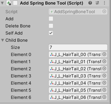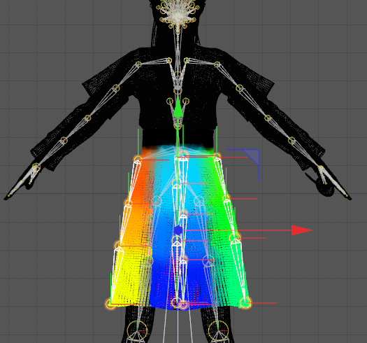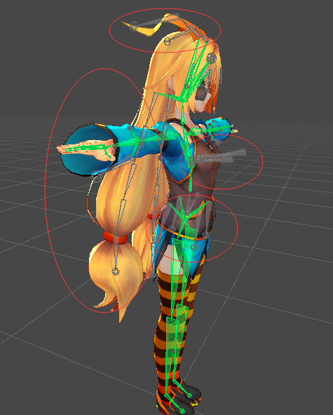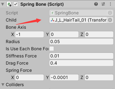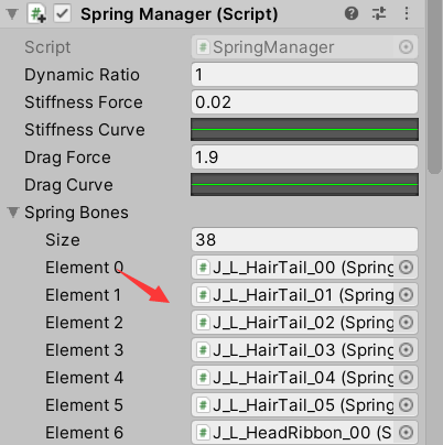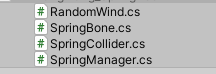 当然了,厉害的技美大大们也是可以独当一面的。制作人物物理效果,有很多方式,常见的方法,就是在做人物动画的时候就设计好,但是这样就出现一个问题,人物衣服动画都是提前设计好的,就会导致有时候动画与实际交互不符,对于高要求项目来说,明显不可取。 我们都知道,制作人物动画一般都是基于骨骼绑定来制作,那么衣服,头发等我们需要和交互结合的骨骼部分,最好的方法当然是通过代码来控制其走向啦~ 这就要求我们在制作模型的时候,就必须给衣服、头发、胸部、首饰等地方也绑定骨骼,骨骼绑定越精细,人物的物理效果越自然,当然性能要求也会增加。CG上的制作有时候还需要绑定肌肉,游戏中少见。 先放一张,汪汪最近在弄的一个模型骨骼,这里胸部并没有添加骨骼支持: 我们看一下更改裙子骨骼会发生什么: 裙子更加蓬松了! 于是乎,我们想到,通过程序,来控制骨骼的旋转,移动方式。 假如这是一个后裙摆,当我们人物往前走的时候,以我们的人物中心为参考,这些骨骼按照惯性影响,移动的时间,距离,都是不同的。骨骼越往前,延迟越小,越往后,延迟越大。紧贴身体的部位,肯定没有多大活动空间,但是没有紧贴的,就会在人物的带动下,过了一段延迟后,才会受到力的影响。女性胸部物理,同样是这个原理,只是胸部倾向于上下延迟位移。 说明完原理后,我们进入正题: 这里汪汪并不贴代码,因为Unity官方已经在不经意间把这个插件提供给我们了,当然,小伙伴们如果觉得效果不好的,可以尝试自己实现,就是利用延迟移动。 小伙伴们可以在商店里找到SDUnity-chan的资源,里面的脚本就是骨骼物理脚本,这个脚本最早应该起源于Unity日本的Unite In the Sky工程文件: 现在给出测试动画,我们不使用官方动画,使用汪汪自己找的人物骨骼动画,动画里只有人体骨骼信息: 我们可以看到动画是挺好看的,但是感觉没有灵魂啊~ 我们先观察Unity酱的骨骼: 我们可以看到,Unity酱的骨骼其实很细致,丰富,该有的都有,我们现在要做的,就是让这些没有被动画驱动的骨骼,动起来,大家有兴趣,可以在Unity的骨骼界面中,拖动各个骨骼来查看模型的效果,这里我们使用官方脚本来实现: 首先设置SpringBone: child下设置此骨骼的子骨骼,子骨骼又添加SpringBone,再设置,不停重复,最后一个不添加。 这里汪汪为了方便,自己写了一个添加工具,在最顶级添加脚本后,点击Add,就能一并加到底,不需要进入PlayMode: 然后是碰撞的添加: 这个主要用来控制我们骨骼碰撞的,避免头发,裙子穿过身体。 最后一步,就是添加一个SpringManager,并在SpringBones下添加我们刚开添加的脚本物体: 同样,为了方便,汪汪也写了一个小工具,一键添加,一键查错: 最后我们看看效果吧!!