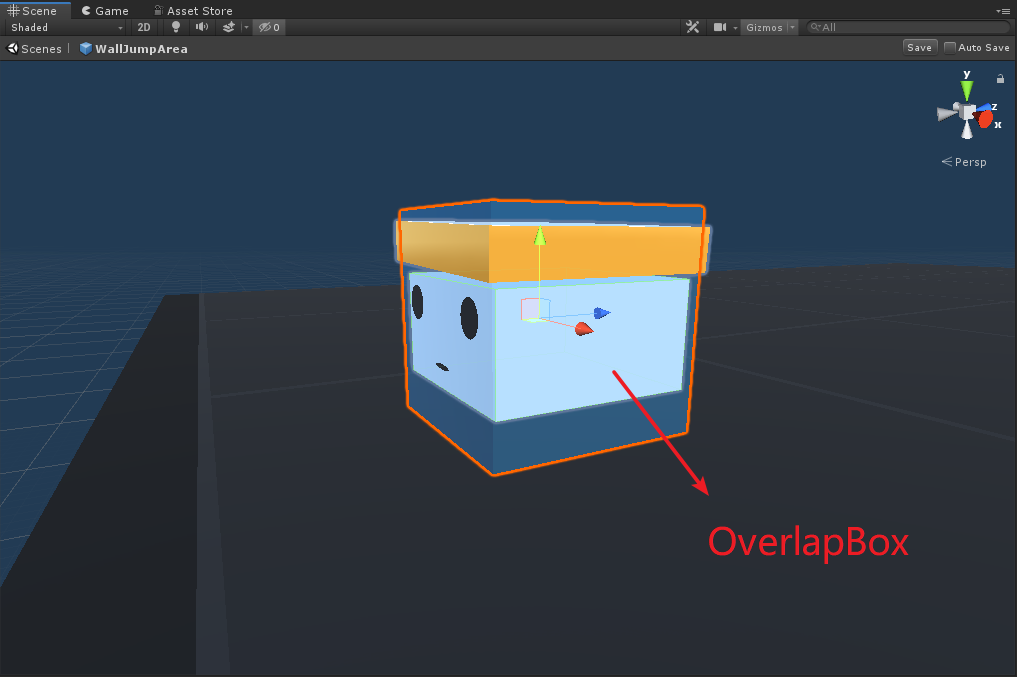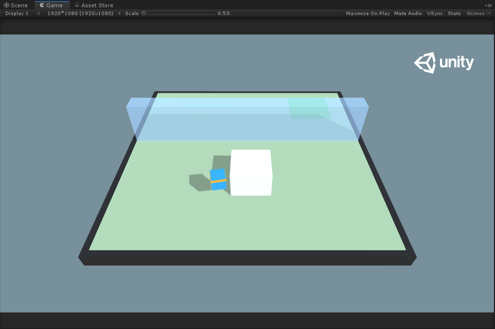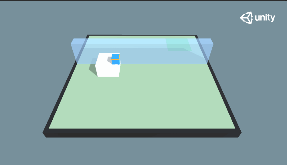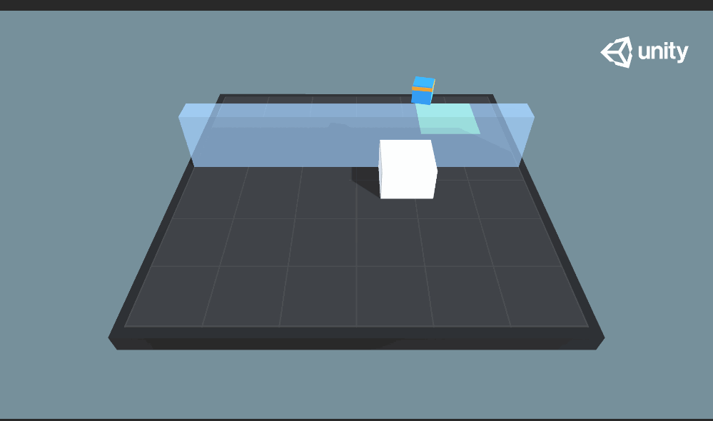 由图中可以看到本示例的效果,小蓝需要越过蓝色的墙体到达绿色的目标地点,此外还可以留意到,蓝色的墙体高度是随机变化的:当蓝色的墙体较高时,小蓝推动大白块当梯子才能越过墙体;当蓝色墙体高度较低时,小蓝则可以直接跳跃过去。