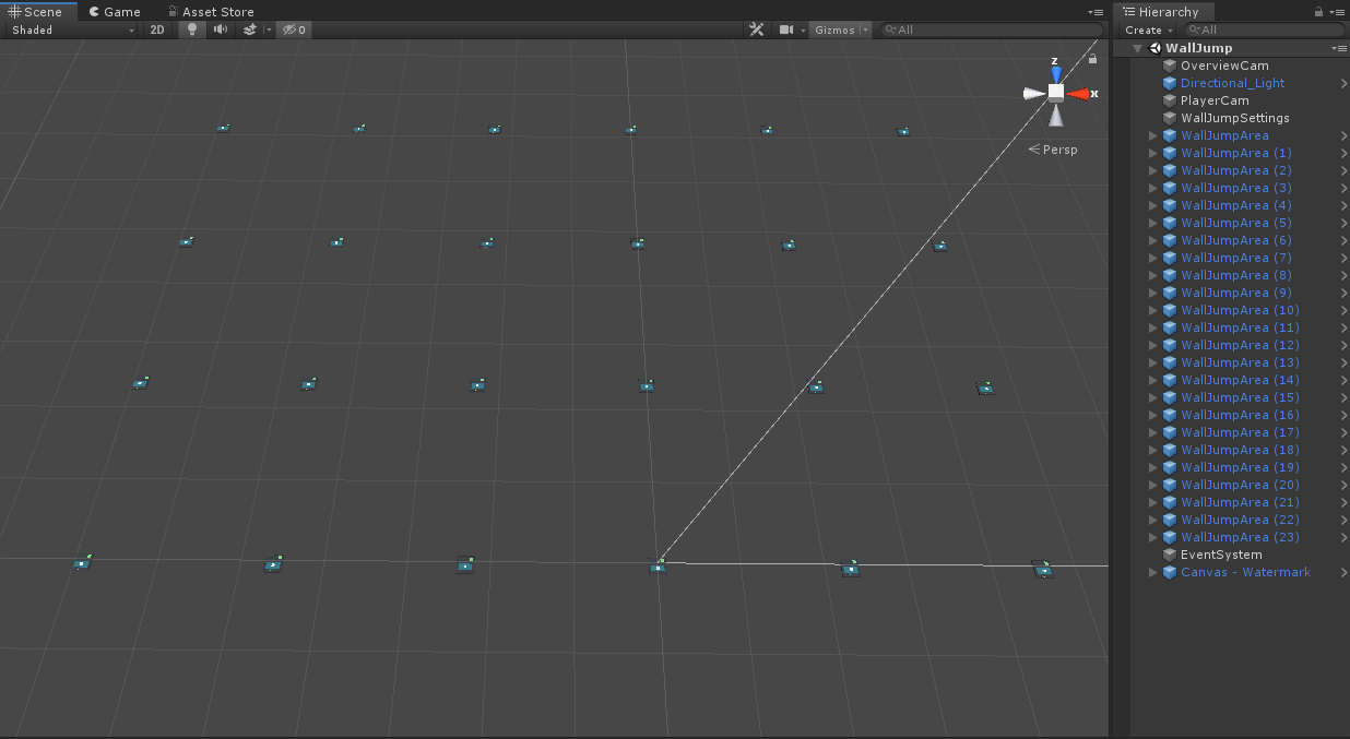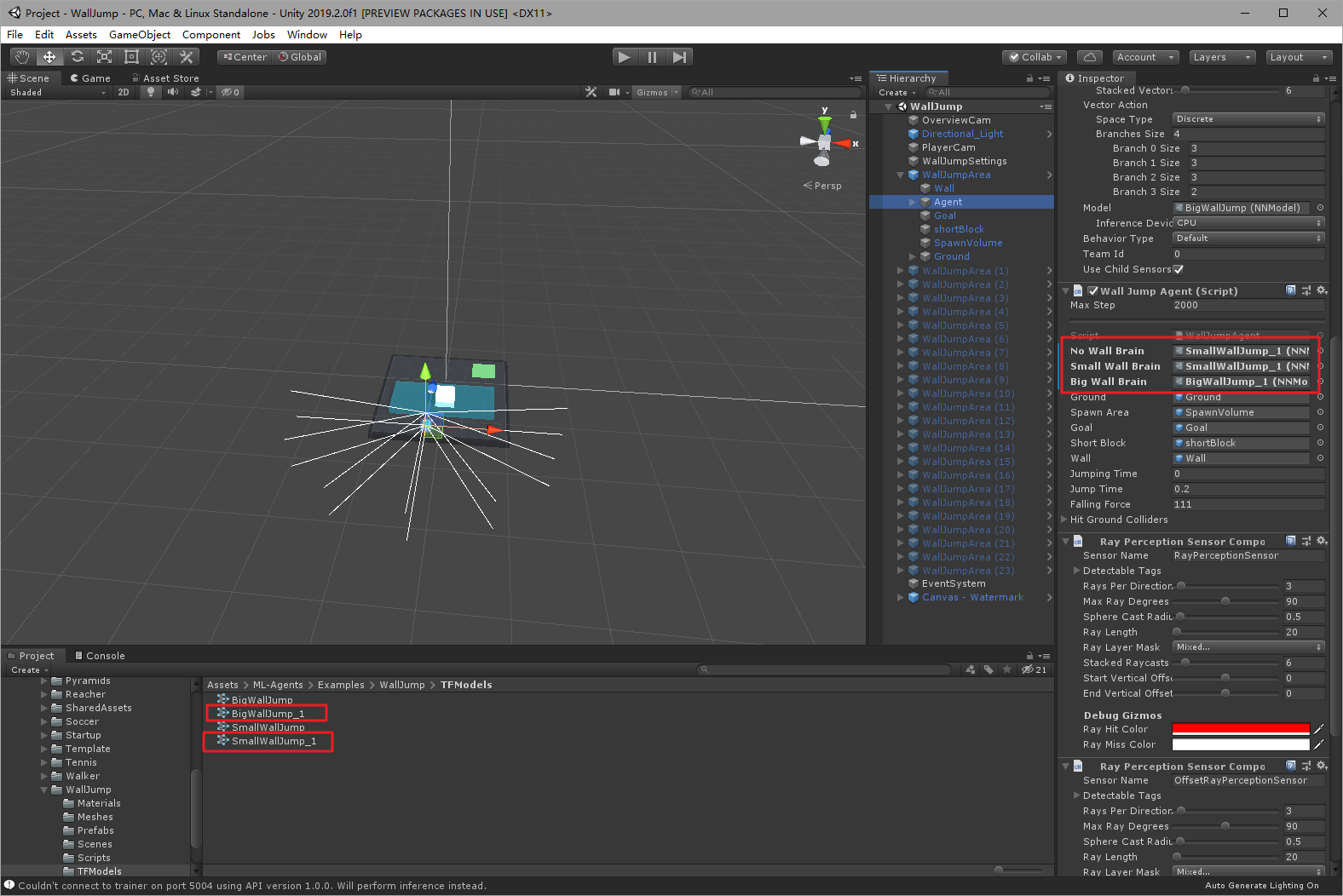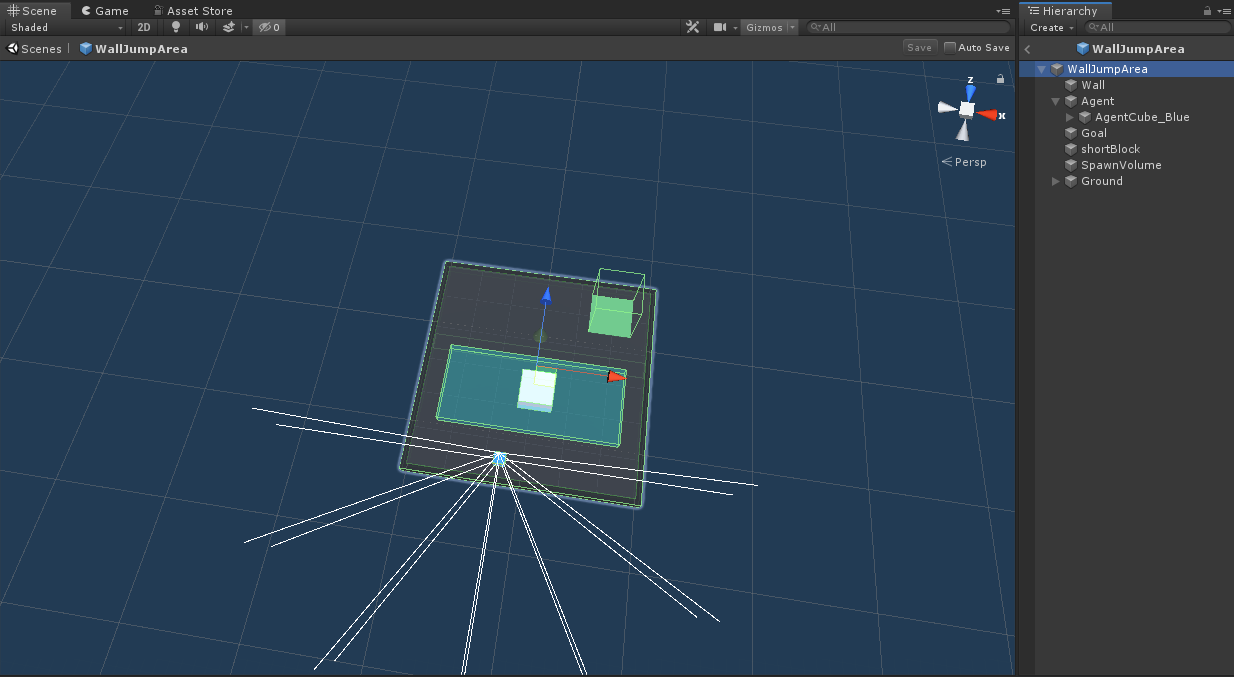 Agents:环境中包含一个链接到两个不同模型的agent。Agent的策略链接改变取决于墙的高度(即墙低的时候<4时,采用SmallWallJump训练,墙高度>4时,采用BigWallJump训练)。策略的改变在WallJumpAgent脚本中实现,下面看代码会有介绍。