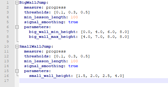 即在SmallWallJump的时候,墙的高度从1.5->2.0->2.5->4.0;在BigWallJump时,墙的高度则一开始会在0-4随机,然后在4-7随机,然后在6-8随机,最后高度固定在8。从此也可以看出课程训练从易到难的特点。