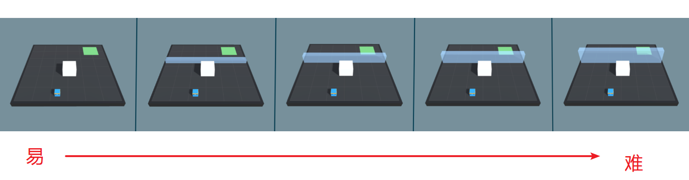 )。如果我们从一个更简单的任务开始,例如让agent朝着一个无障碍的目标前进,那么agent则会很容易地学会完成任务。在此基础上,我们再通过增加墙体的大小来慢慢增加任务的难度,直到agent可以完成最初几乎不可能完成的任务(就是小蓝通过大白块间接越过高墙)。下图展示了任务由易到难的过程: