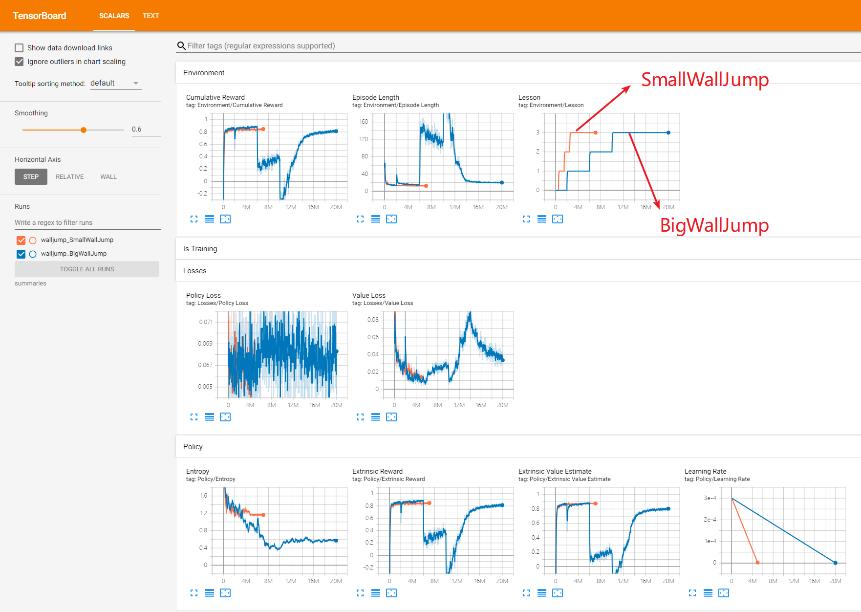 首先因为要训练两个Model,分别对应SmallWallJump和BigWallJump,因此在配置文件中对应的是两个部分。可以看出Small的