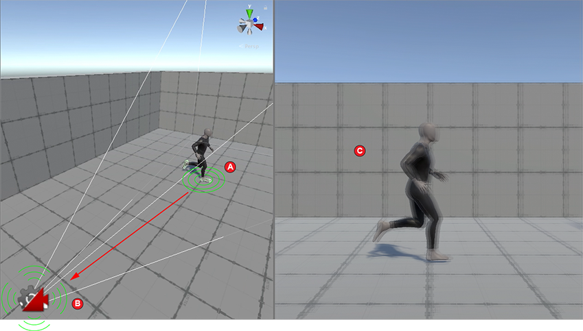 如下图中,角色的脚是震动源。当脚与地板(A)发生碰撞时会产生震动。虚拟相机上的Impulse Listener扩展会对震动作出反应,那就是相机的晃动(B),会导致Game窗口中C的结果。