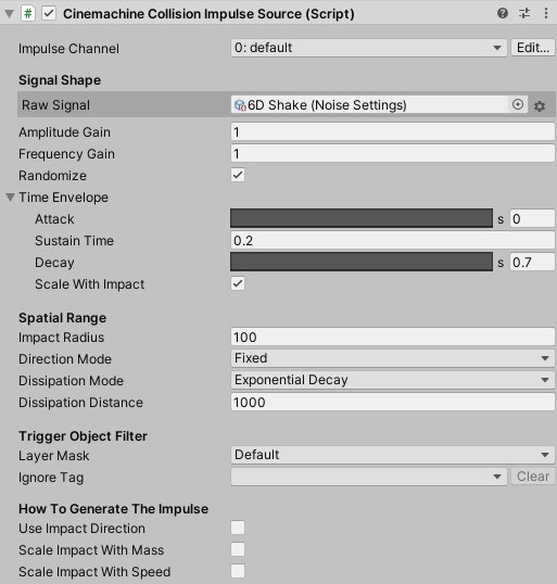 原始震动信号定义了相机晃动的基本“形态”,Impulse Source组件中控制了一些其他重要的属性,影响生成的震动。
