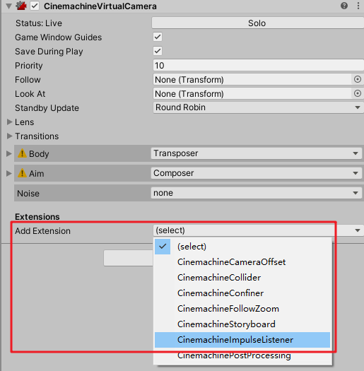 Impulse Listener Cinemachine的扩展,添加了这个扩展后虚拟相机就能“感受到”震动,并且作出晃动的反应。