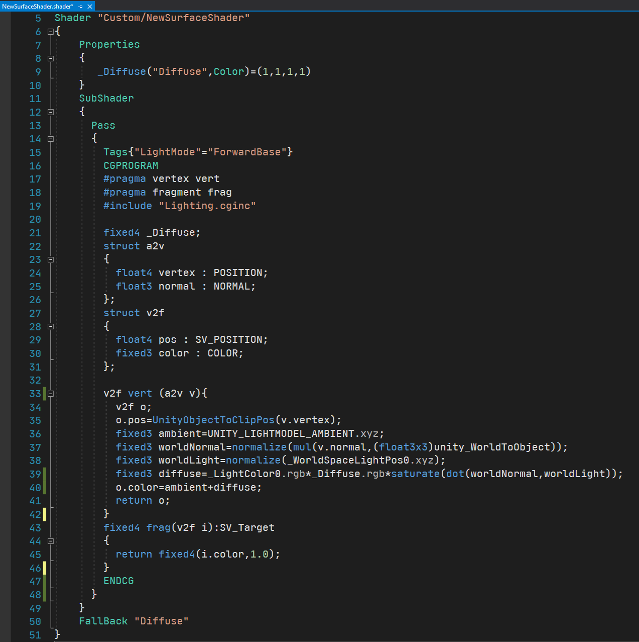 之后我们来实现顶点函数部分: 因为计算都在顶点函数中,因此片元函数只需要将计算结果输出即可: fixed4 frag(v2f i):SV_Target { return fixed4(i.color,1.0);//i.color为rgb三个分量,1.0为alpha分量,凑在一起为就为颜色的rgba四个分量。 } 最后设置降级回调函数为Diffuse: FallBack "Diffuse"