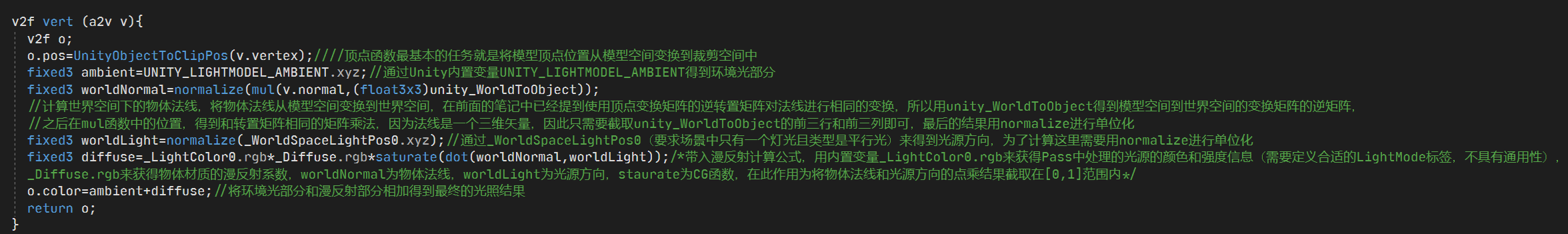 为了能在CG代码中使用Properties块中的属性,需要重新用fixed4类型来声明Color类型的_Diffuse,通过这个就得到了漫反射计算公式中需要的材质漫反射属性m。之后,还需要定义顶点着色器的输入a2v和输出v2f结构体(输出结构体同时也是片元着色器的输入结构体): fixed4 _Diffuse; struct a2v { float4 vertex : POSITION; //将模型的顶点信息存储到vertex变量中 float3 normal : NORMAL; //为了访问顶点法线,需要在a2v中定义一个normal变量,之后用NORMAL语义来表明在编译时将模型顶点法线信息存储到normal变量中 }; struct v2f { float4 pos : SV_POSITION; fixed3 color : COLOR; //color用来存储从顶点着色器中计算得到的光照颜色信息,这里:COLOR语义也可以换成:TEXCOORD0语义 };