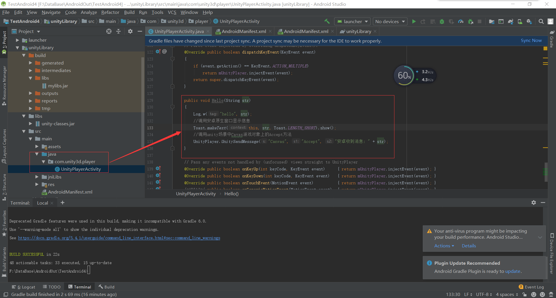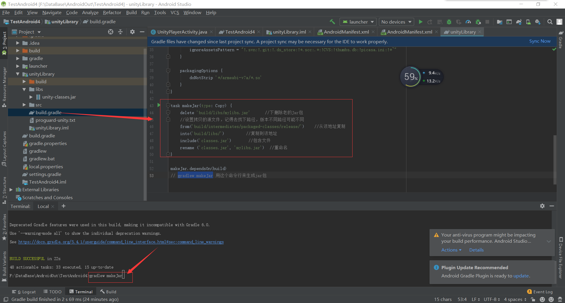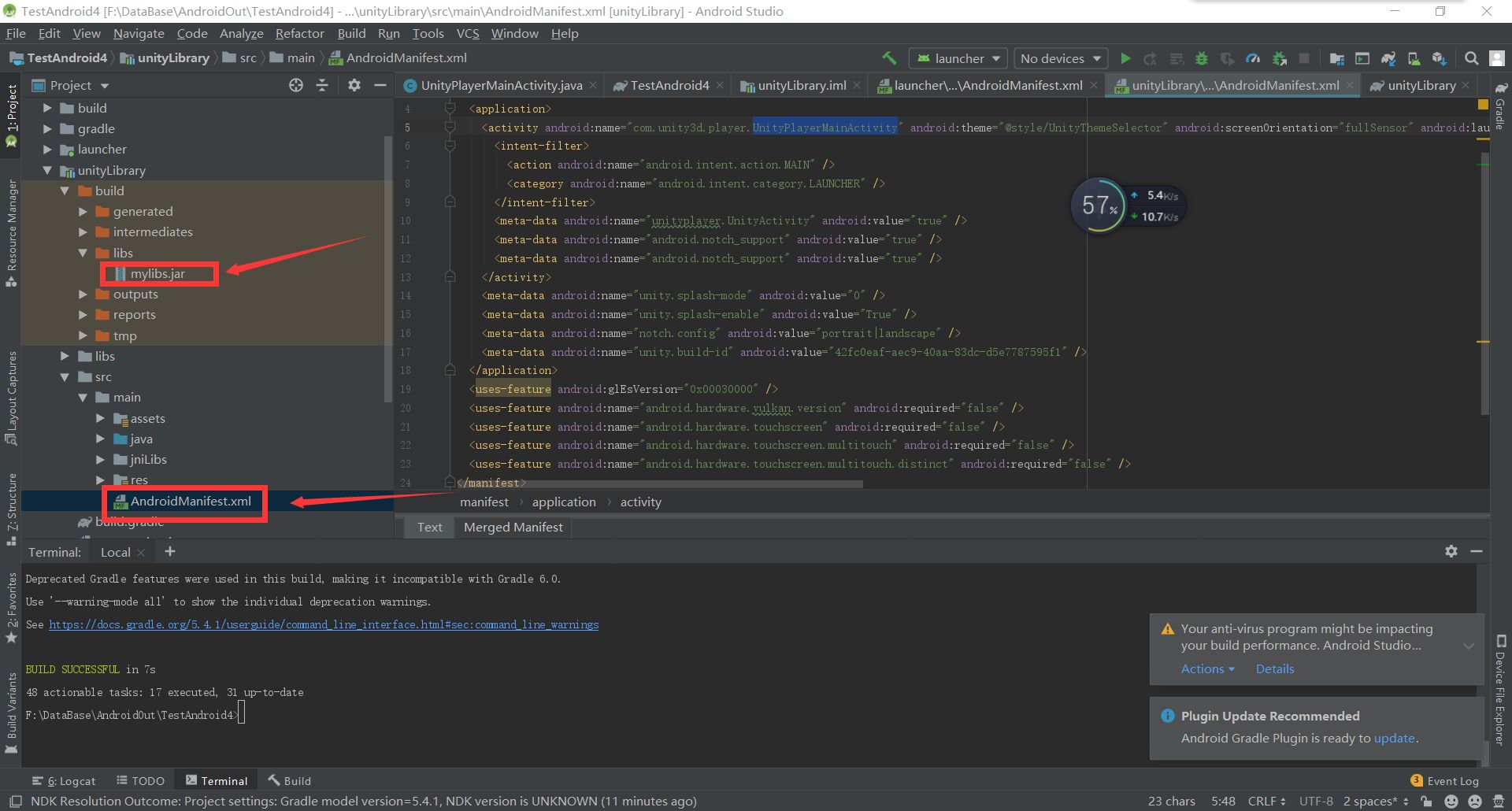 选择上部菜单Build-->Clear Project 然后执行命令gradlew makeJar 成功后会生成jar包,这个jar里面只包含java文件夹里面的代码 右键mylibs.jar然后在弹出菜单里面选择Show in Explorer获得jar包 右键AndroidManifest.xml然后在弹出菜单里面选择Show in Explorer获得AndroidManifest.xml 把mylibs.jar放在unity项目的Plugins/Android/libs文件夹下 把AndroidManifest.xml放在unity项目的Plugins/Android文件夹下