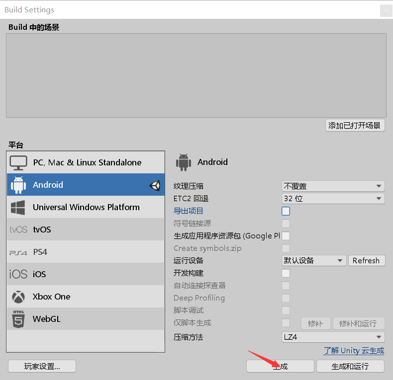 点击File-->Build Settings 选择Build导出安卓apk