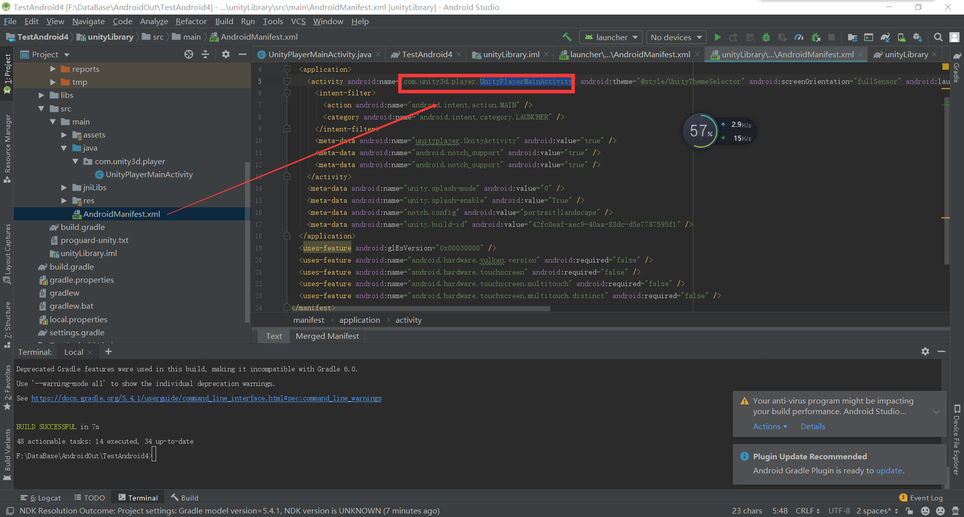 如果你有现成的unity导出的安卓工程以上步骤可以略过 重命名UnityPlayerActivity类为UnityPlayerMainActivity(这里随意起的一个名字) AndroidManifest.xml里面最开始启动的活动改为UnityPlayerMainActivity 这个步骤主要是为了防止jar包里面的类和unity导出的类UnityPlayerActivity重名