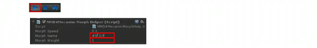 在播放场景的状态下,将MMD4MecanimMorphHelper的MorphName设置为表情名称并将MorphWeight设定为1时,模型的表情就会发生变化。