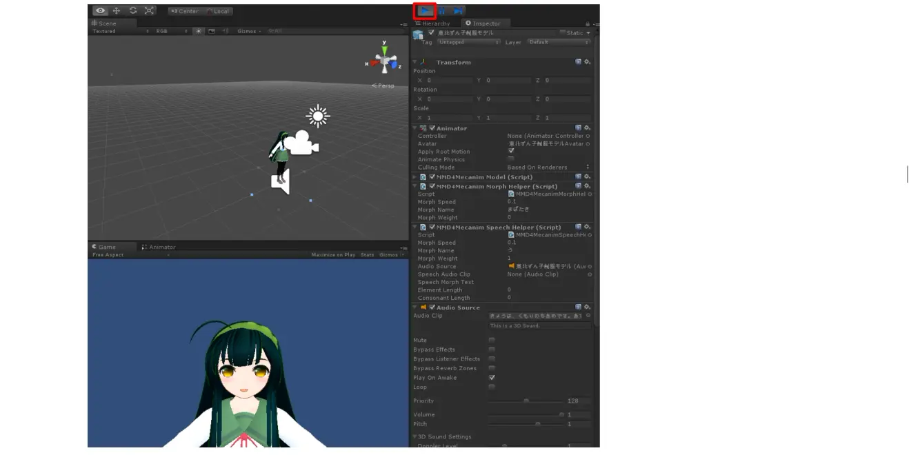 - 将声音文件添加到项目中,并以拖拽的方式导入MMD4MecanimSpeechHelper的SpeechAudioClip中。 将声音文件导入 当你开始播放场景时,将会自动播放声音和嘴部(口)的变形动作。 播放场景