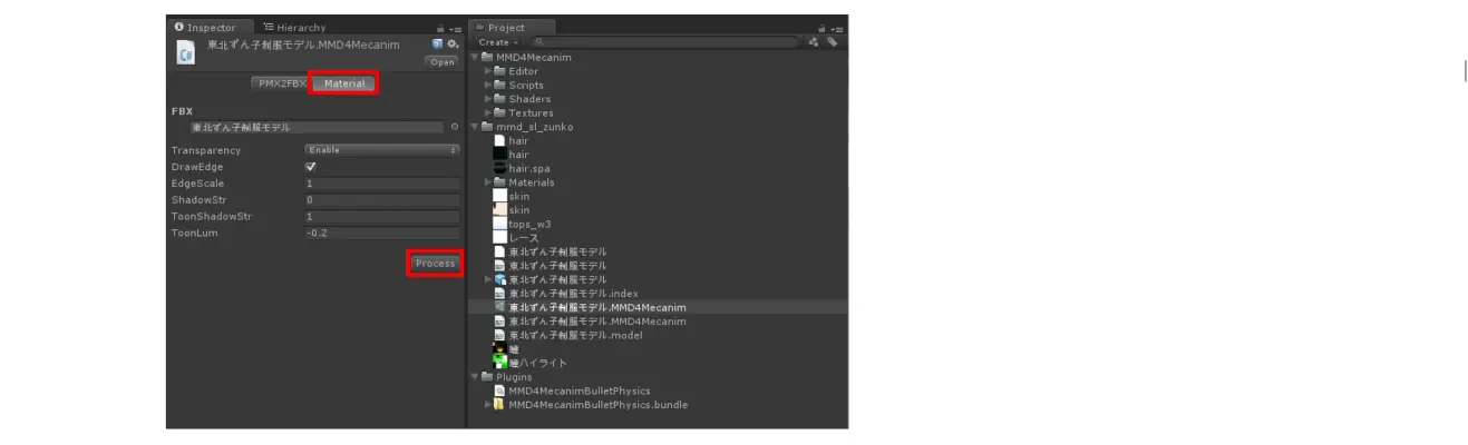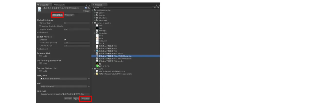 東北ずん子(MMD)的导入 将解压的文件拖入项目中,点击MMD4Mecanim项目的PMX2FBX选项卡的Process按钮。 导入MMD文件