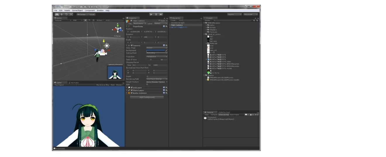 将東北ずん子的FBX导入场景(Hierarchy)后,配置*Directional Light*,调整摄像机的位置和角度。