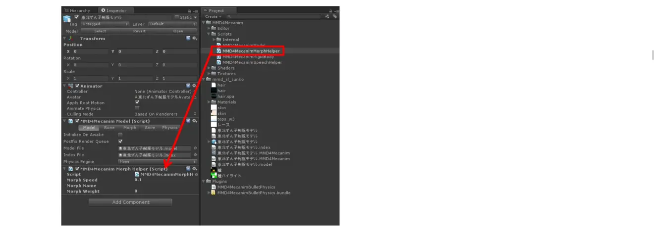 将包含在*MMD4Mecanim/Scripts*中的, *MMD4MecanimMorphHelper*组件拖拽导入到模型中。