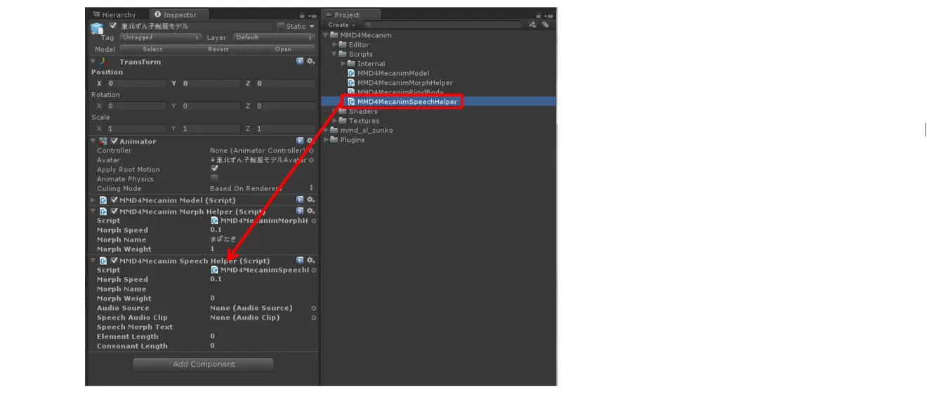 - 将MMD4Mecanim/Scripts中包含的MMD4MecanimSpeechHelper组件拖拽导入到模型中。 将朗读组件导入模型中