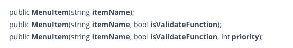 我们来看下 MenuItem 这个属性构造的定义。 第二个参数是,是否是验证方法,目前不用理解,官网上默认是 false。 第三个参数,意思是优先级,表示 MenuItem 所在的显示顺序,数值越大越在底部。