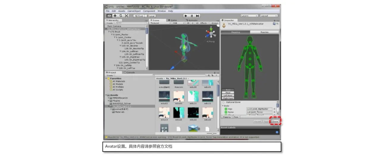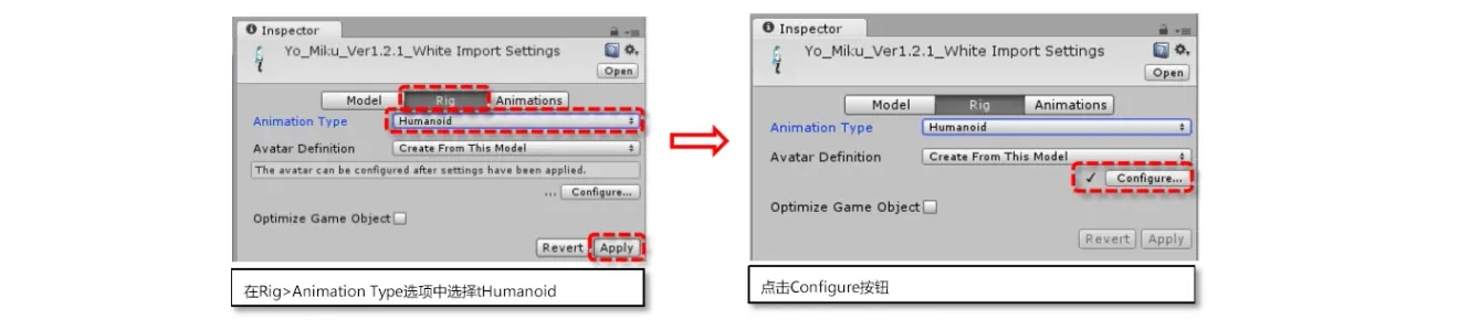 在Inspector窗口中选择Rig,在Animation Type中选择Humanoid,然后按Apply按钮。 接着,按Configure按钮转移到Avatar设定画面。 如果转移到Avatar设定画面,按Done按钮暂时退出设定。
