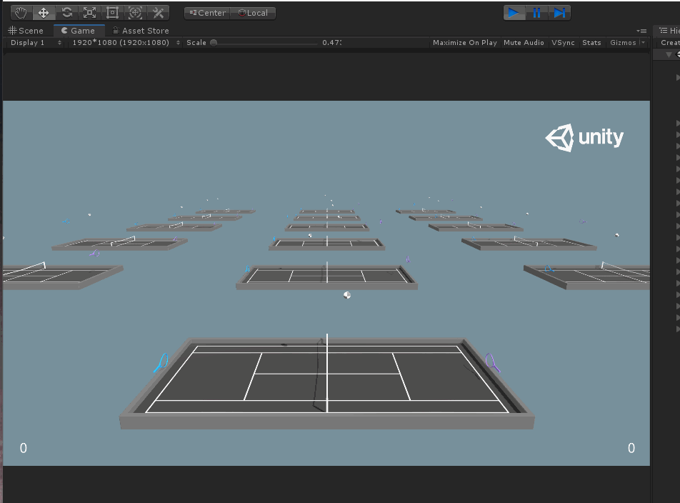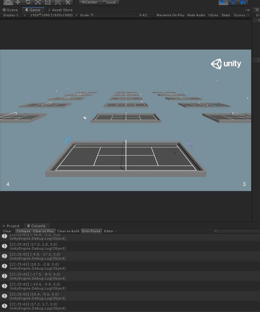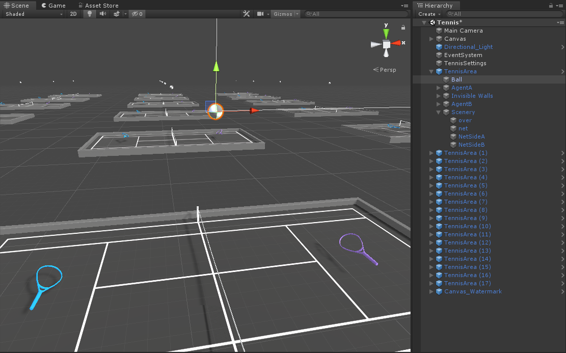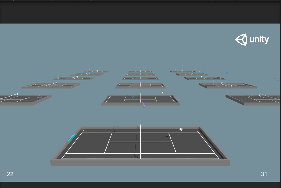 OK,可以看到画面中有18个网球场,然后蓝色的球拍和紫色的球拍互相对打。这里注意一下,场景虽然都是3D的,但实际上球拍和球只在球场的中轴线上上下左右移动,也就是说其实换个相机位置的话,这里其实是个二维打球模拟。