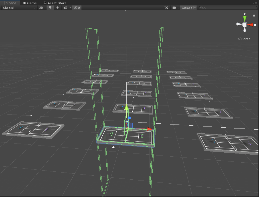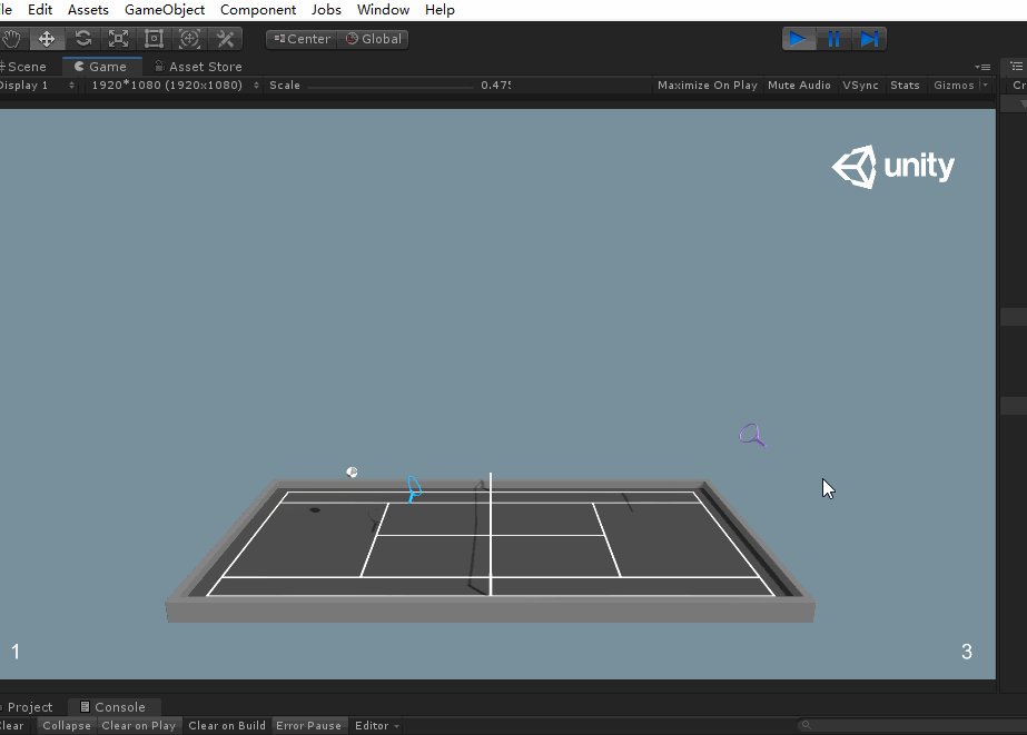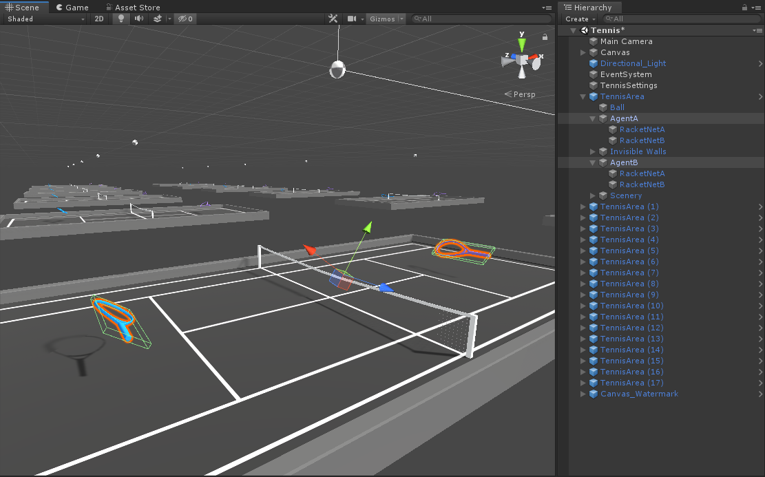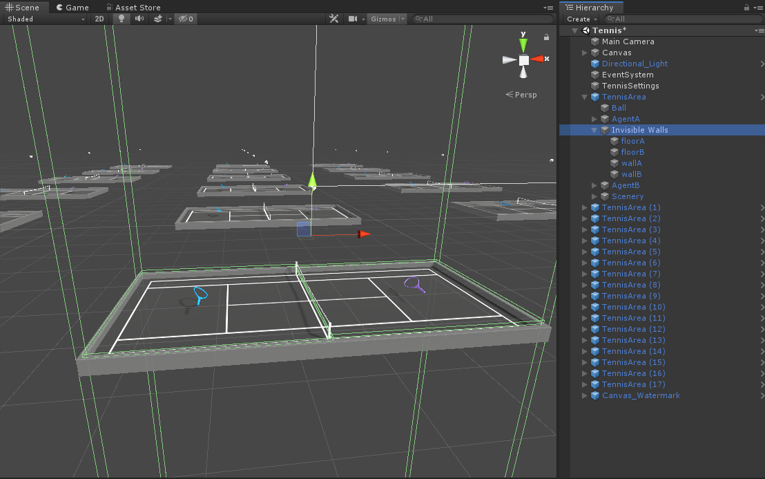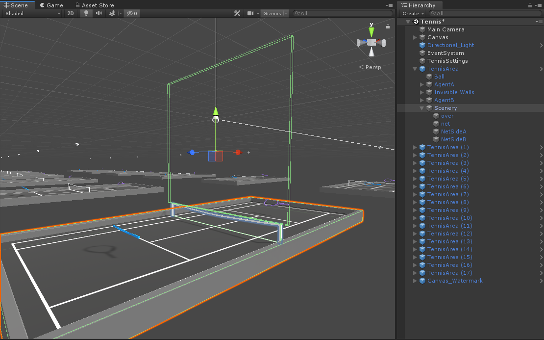 OK,可以看到画面中有18个网球场,然后蓝色的球拍和紫色的球拍互相对打。这里注意一下,场景虽然都是3D的,但实际上球拍和球只在球场的中轴线上上下左右移动,也就是说其实换个相机位置的话,这里其实是个二维打球模拟。