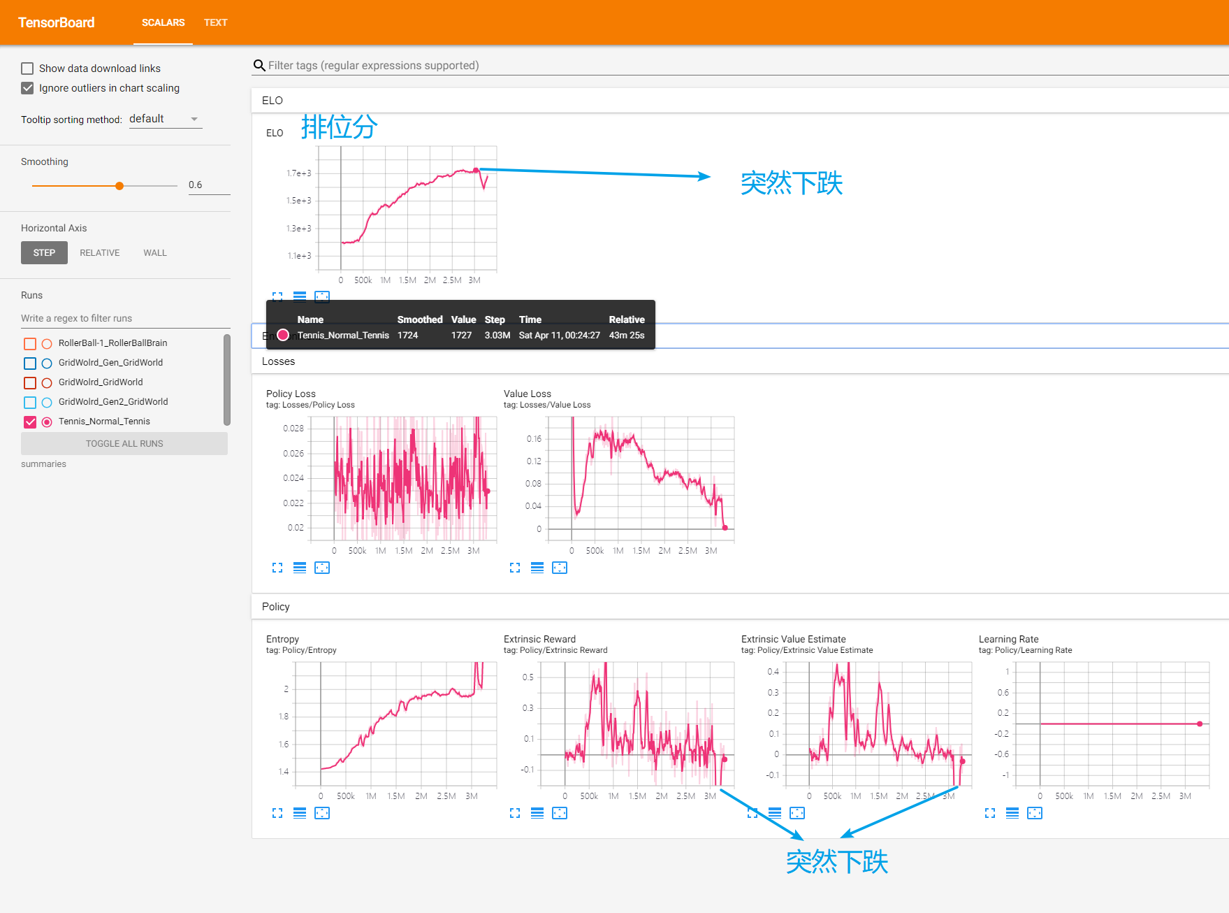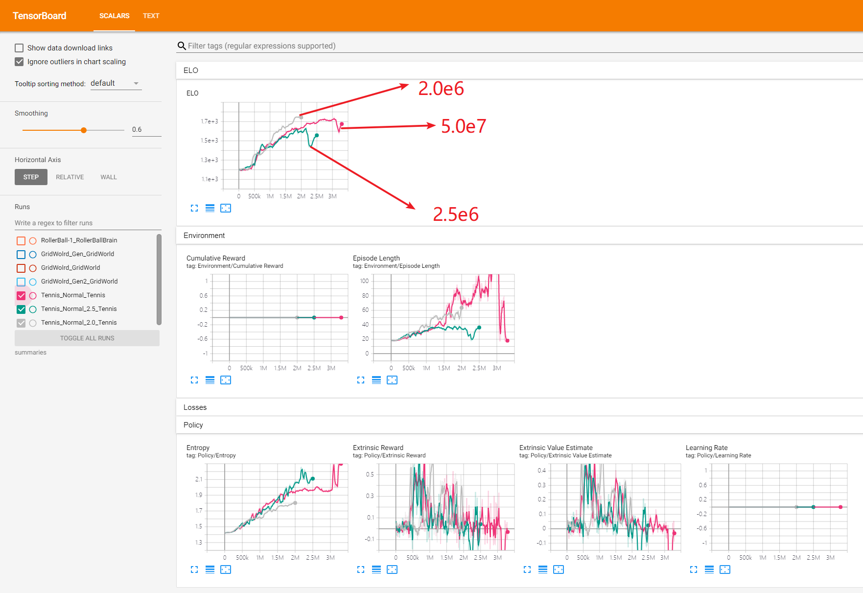 这里我怀疑是这样的,因为在代码中,没有设计在训练过程中,如果对抗双方在一局里长时间来回打球,而给双方同时奖励的机制。当接近3百万时,双方的球技都挺好了,能打的有来有回的时间越来越长,导致长时间Brain没有收到奖励,使得Brain发现如果一直打可能一直都不能得分,自己的排位也上不去,但是如果丢球,还有机会拿奖励分,致使Brain产生消极比赛送分的决策= =||||,这里也是很逗了。所以我将tennis的训练最大步骤设置为2.5e6差不多到达此时情况下ELO的最大值,正所谓是实践出真知啊。