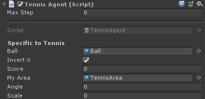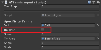 - 首先,一开始运行时,以上的Start()函数是晚于球拍Agent的初始化方法InitializeAgent()的,即MatchReset()方法是在InitializeAgent()之后的。在源码里,TennisArea脚本第32行设置了球的比例,而注意球的比例是可变参数(现在官方改成Parameter Randomization了,即随机化参数,原来是Generalized Reinforcement,即可变强化训练,叫法改了用法一样,就是可变参数)。因此,不管在Agent的InitializeAgent()里如何设置球的比例,在后执行的MatchReset()方法里都会将球的比例重新设置回(0.5f,0.5f,0.5f)。