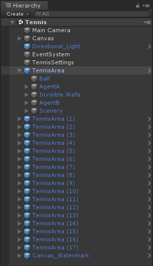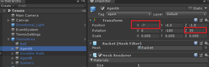 这个示例中环境初始化分为两个部分,一个部分是处于父节点的TennisArea脚本,另一个是球上的HitWall脚本。前者主要在环境重置时初始化球的位置,以及限制球的速度;后者则是包含了打球规则以及初始化球拍、调用TennisArea来初始化比赛。