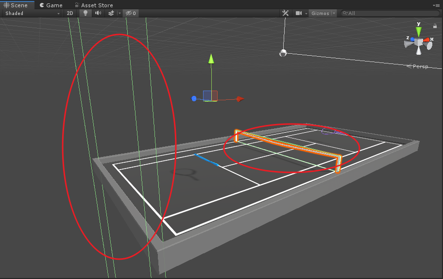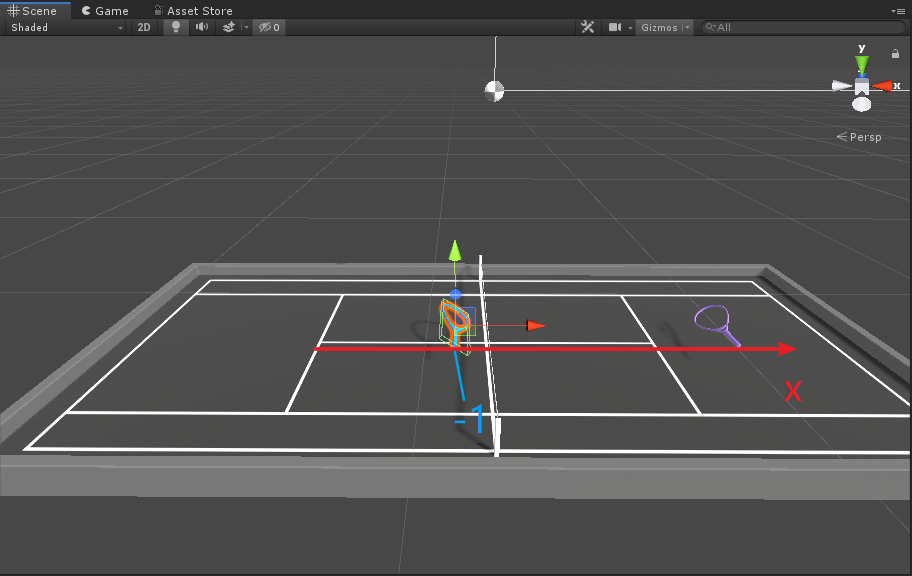 在这里深入思考一下,为什么只有限制球拍向前移动,而不用去限制球拍向后移动?可能大家也有相应的疑问,其实这里利用两个碰撞体就可以限制球拍的移动了,即网的碰撞体以及场地后方碰撞体: