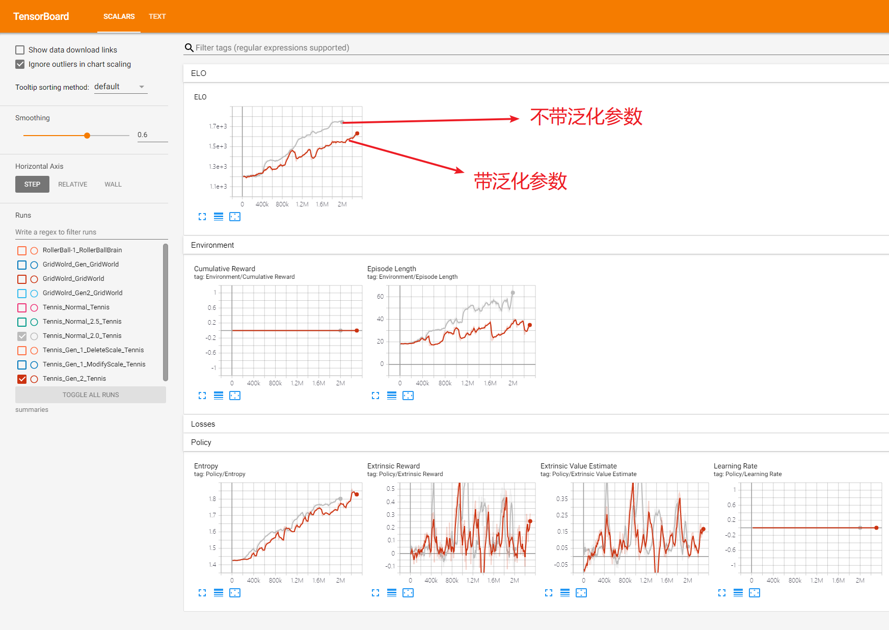 会发现训练出来的模型还是有问题,然后我继续调整最大训练步数为2.0e6,对比一下tensorboard: