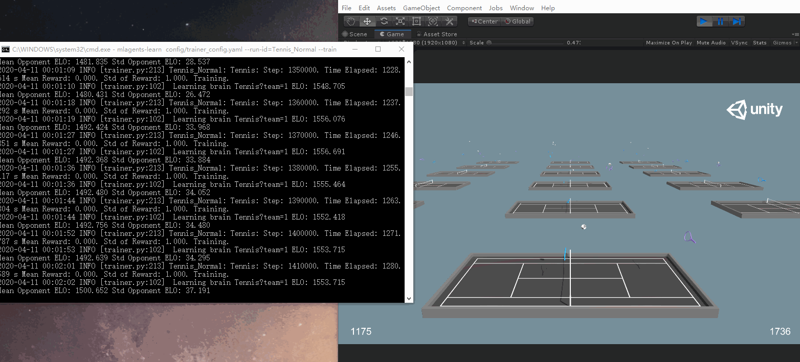 首先是对抗训练中会存在ELO图表,其实你就可以看成是排位分的变化趋势,可以明显观察ELO在大概在3百万步时突然下跌,包括Reawd也是,在3百万步处有异常数据。将训练到一半的Tennis_Normal.nn文件放到Unity中: