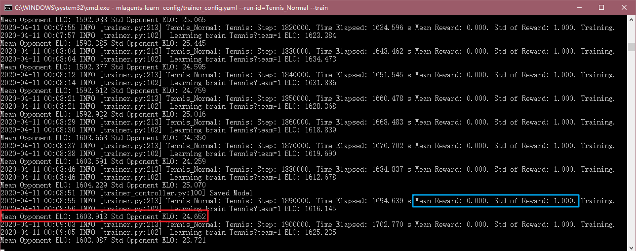 通过对ELO的了解,也可以发现,这里因为用到了对抗训练,所以采用Mean Opponent ELO和Std Opponent ELO来看训练的效果,其中我们会发现命令行中有一行是Tennis?team=1 ELO:1615.145,这里其实就代表了team为1的agent(即球拍B),现在它的ELO(可以简单理解为排位分)是1615.145,你会发现它的ELO会随着训练的进行逐渐升高,相当于一直打排位,训练自己上王者。